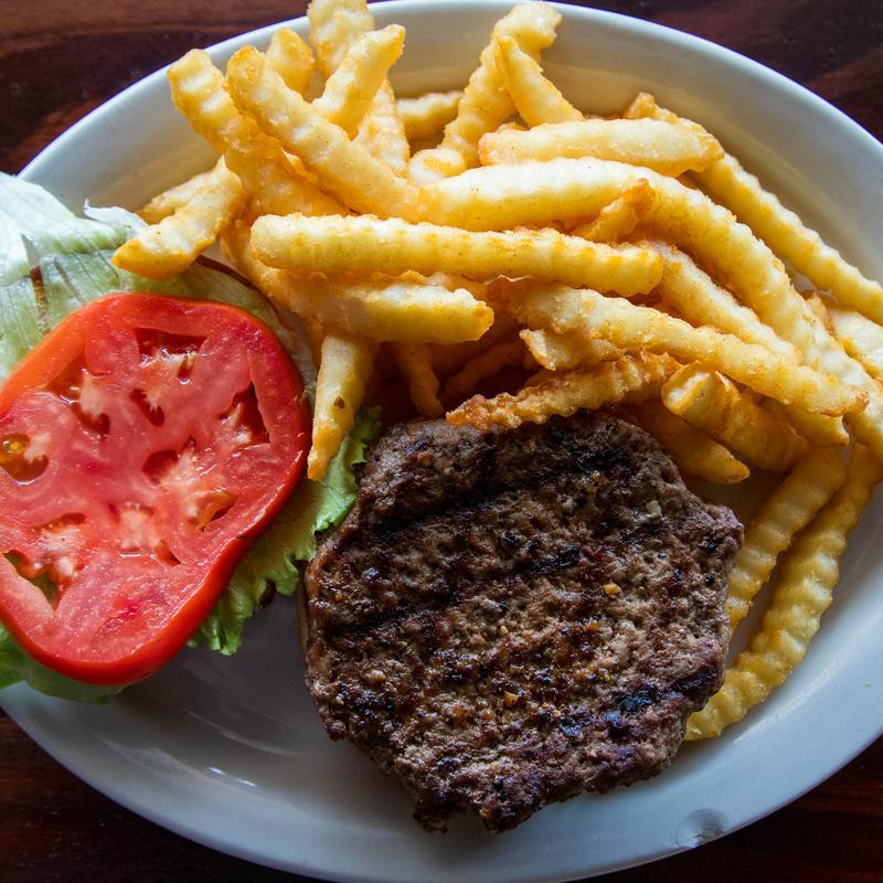 Our homemade 8 oz burger, spiced to perfection and mixed with fresh garlic and chopped onions. Served with lettuce, tomato, pickles, mustard and ketchup • Add Cheese +$0.99 | Add Bacon +$1.99
