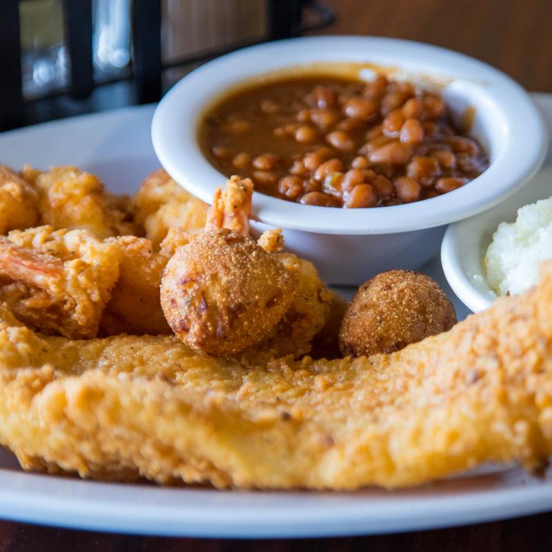 One piece of fried or grilled catfish fillet and eight pieces of fried or grilled shrimp.
