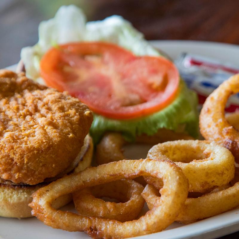 Tender grilled or fried chicken breast topped with lettuce, tomato, and onions.
