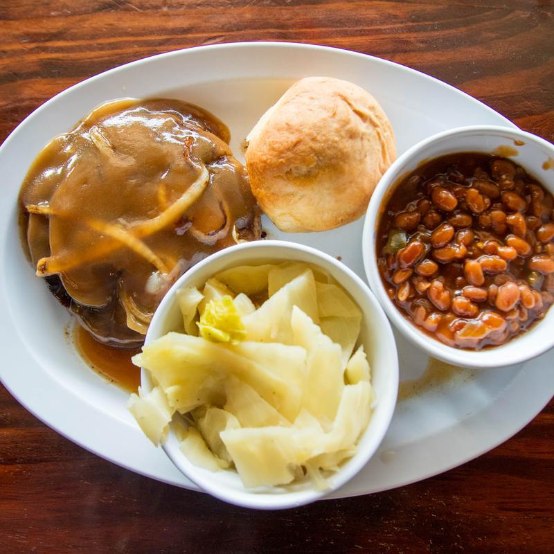 A 10 oz chopped steak smothered with savory brown gravy and onions.