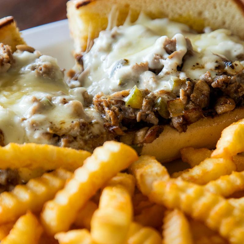 Thinly sliced pieces of steak or chicken with grilled green peppers, mushrooms, onions, and melted